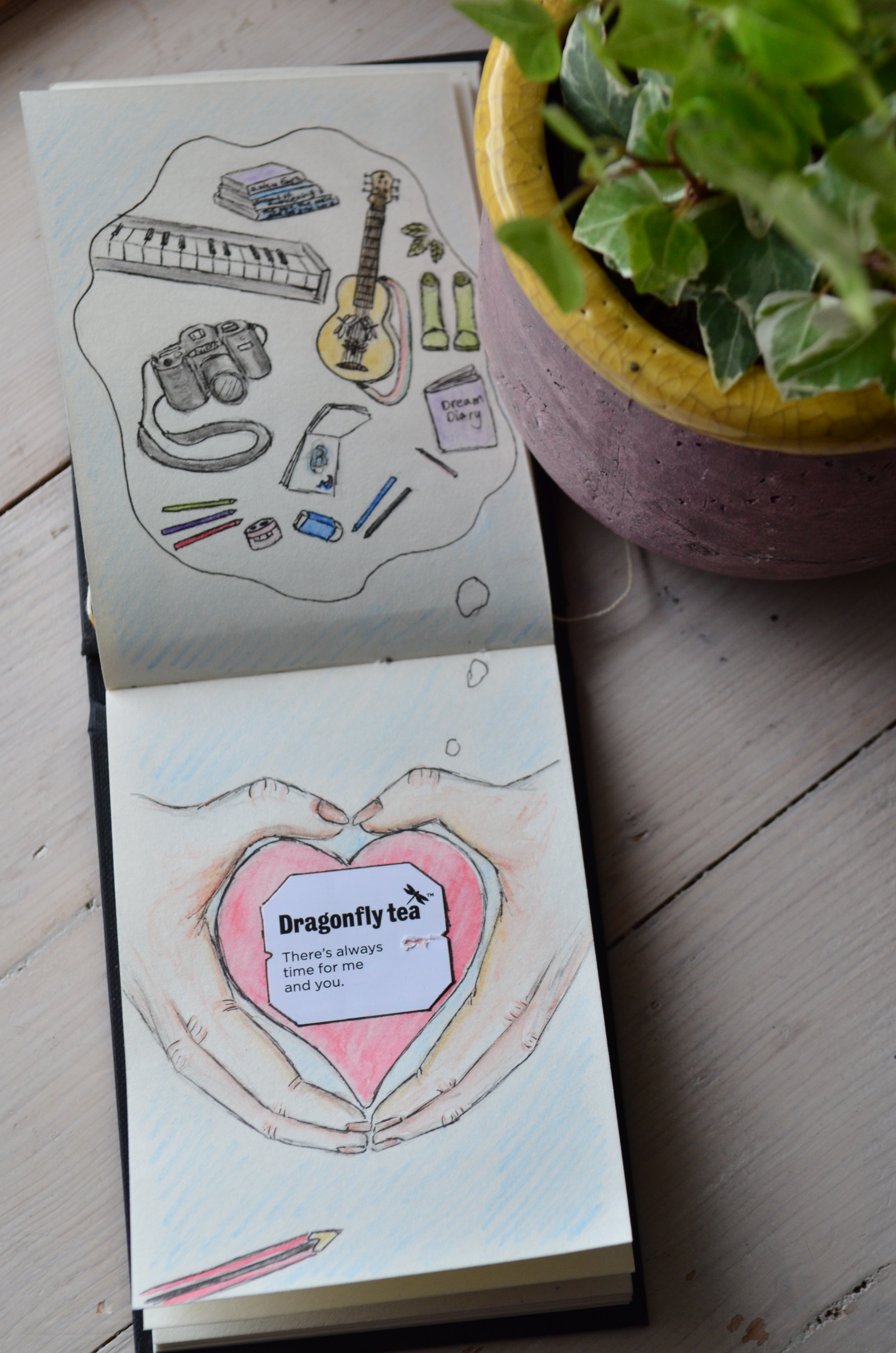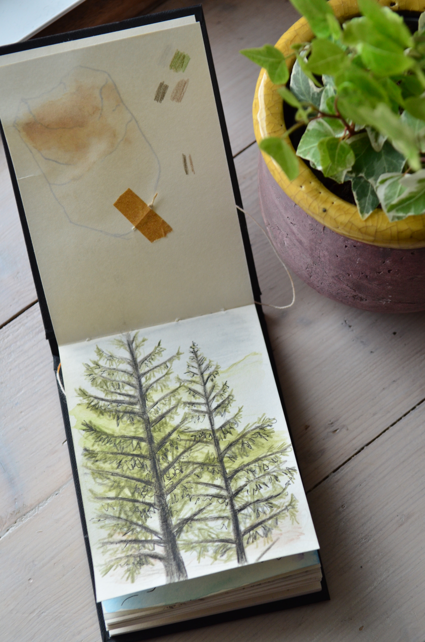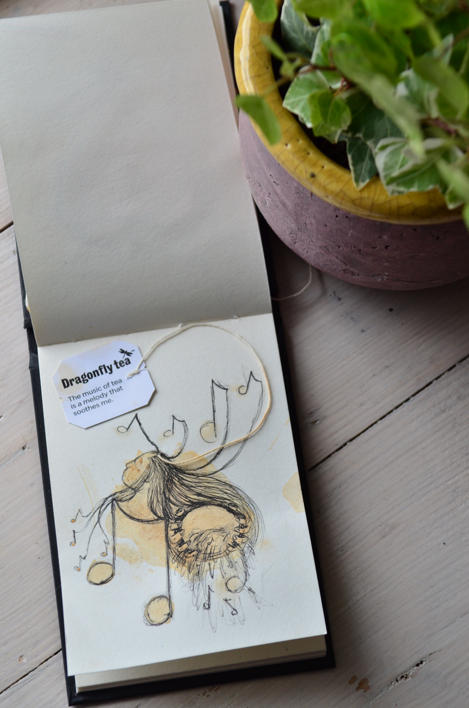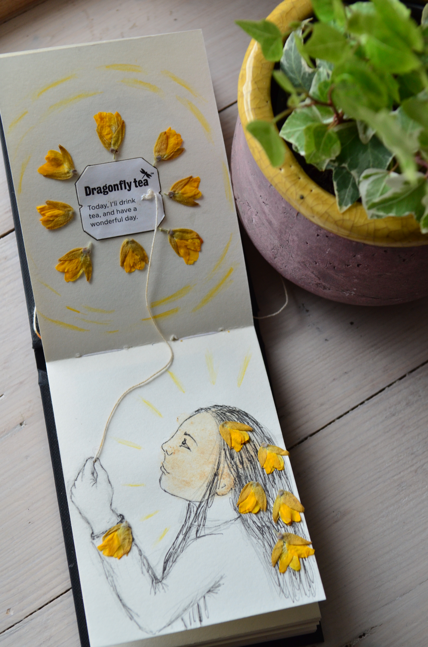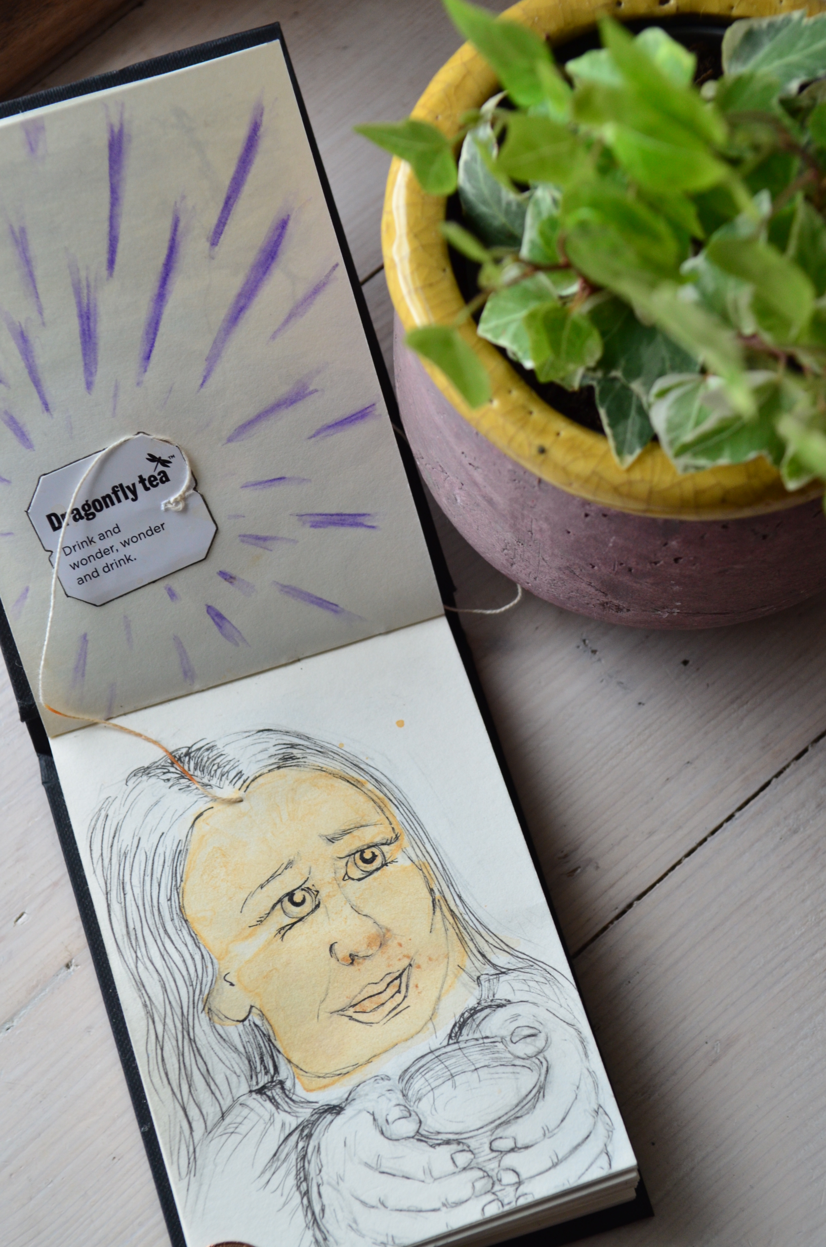 I had a stash of my favourite chai tea, with enough teabags for one each day. Very early on I discovered that the daily message on the teabag label seemed quite apt for how I was feeling or offered a little piece of wisdom to carry me into the day ahead. I took to picking the tea-bag I was drawn to and seeing what my daily message was. I started making artworks inspired by the messages, sometimes using the print of the wet tea bag itself on the paper, to create an initial image I could add to. This became a running theme in the sketch book, amongst other illustrations.